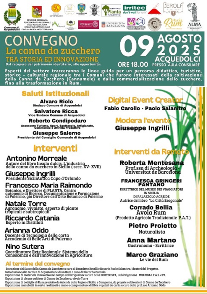 Il lavoro preparatorio del Convegno è stato condotto da Paolo Salanitro, Benedetto Rotelli, da Roberto Condipodaro Assessore alle Attività Produttive del comune di Acquedolci , dal Vice Sindaco Salvatore Ricca, dal Presidente del Consiglio Giuseppe Salerno. Importante è stato l’impegno del consulente Sergio Mezzanotte e dell’Assessore ai Lavori Pubblici Salvatore Lupica, dal Sindaco Alvaro Riolo che in questi anni ha dato spazio ad attività e visibilità a questa coltura simbolo identitario di Acquedolci, unico comune in Europa ad avere impresso sul Gonfalone Istituzionale quattro culmi di Canna da Zucchero, scelta voluta negli anni ’80 dal prof.re Alfonso Di Giorgio già Assessore alla Cultura.