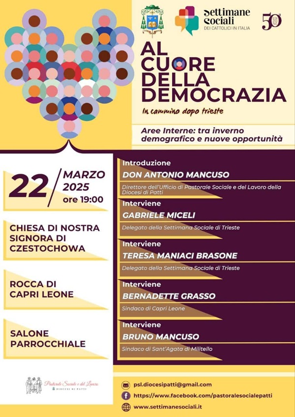 Il 22 marzo 2025, la Chiesa di Nostra Signora di Czestochowa a Rocca di Capri Leone ospiterà un evento significativo nell’ambito delle Settimane Sociali dei Cattolici in Italia. L’incontro, intitolato “Al Cuore della Democrazia: In Cammino Dopo Trieste”, si concentrerà sul tema “Aree Interne: tra inverno demografico e nuove opportunità”, un argomento di grande rilevanza per il futuro del territorio.
