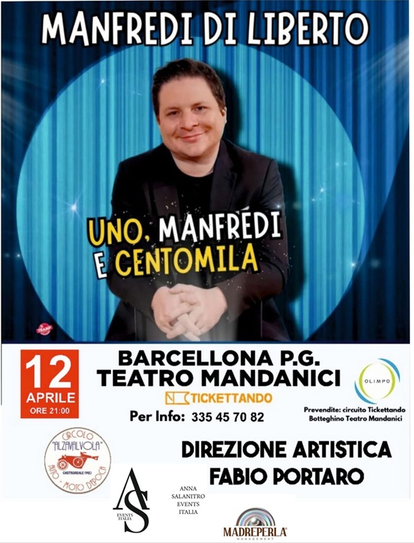 Una serata all’insegna della comicità e della leggerezza sta per arrivare al Teatro Mandanici. Manfredi Di Liberto, attore e comico palermitano, sarà protagonista di “Uno, Manfredi e Centomila”, spettacolo unico nel suo genere che promette di conquistare il pubblico con un mix esplosivo di risate, magia e ironia. L’appuntamento è per sabato 12 aprile, in uno show imperdibile organizzato dall’Agenzia Madreperla, una collaborazione nata tra le agenzie Olimpo, Anna Salanitro Event Italia e il Circolo Alzavalvola di Castroreale (ME) presieduto da Enrico Munafò, per la Direzione Artistica di Fabio Portaro.