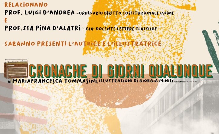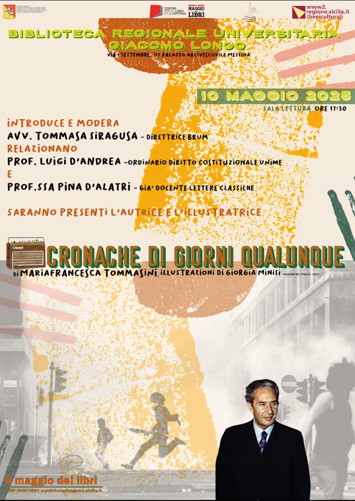 Biblioteca Regionale di Messina –Secondo Appuntamento “Il Maggio dei Libri”- “Cronache di giorni qualunque” – di Maria Francesca Tommasini, illustrazioni a cura di Giorgia Minisi – Presentazione del testo di Maria Francesca Tommasini, illustrazioni a cura di Giorgia Minisi, sabato 10 maggio 2025, ore 17:30.