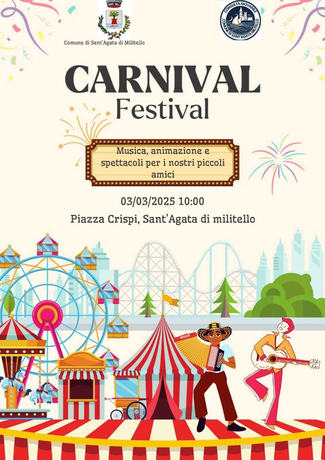 Il Comune di Sant’Agata di Militello, in collaborazione con la Consulta Giovanile, è lieto di annunciare l’attesissimo Carnival Festival, un evento dedicato ai bambini che si terrà il 3 marzo 2025 a partire dalle ore 10:00 in Piazza Crispi.