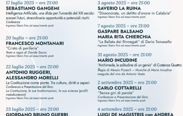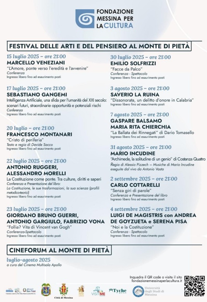 Proseguirà fino al 4 settembre – per un totale di 11 appuntamenti – il “Festival delle Arti e del Pensiero al Monte di Pietà”, realizzato dalla Fondazione Messina per la Cultura in collaborazione con l’Università di Messina. Il ciclo di incontri, inaugurato il 15 luglio con la conferenza di Marcello Veneziani intitolata “L’Amore, ponte verso l’eredità e l’avvenire”, proseguirà con interventi su temi di grande attualità come l’intelligenza artificiale, spettacoli, dibattiti produzioni teatrali e musicali.