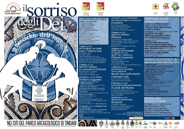 Prima uscita il 25 e il 27 luglio al sito paleontologico di Acquedolci e al Villaggio preistorico di Milazzo, con “St1, la prima donna” di Marina Romeo (prima nazionale), per la sezione “La Preistoria del Parco”, mentre il 18 e il 21 agosto si terrà all’area archeologica di Tindari e nel sito di Halaesa Arconidea (Tusa) uno degli eventi di punta de “Il Sorriso degli Dei”: Tyndaris Augustea, spettacolo teatrale itinerante prodotto dal Parco Archeologico e dalla Proloco di Patti. Tra i siti protagonisti della rassegna anche la Villa Romana di San Biagio (Terme Vigliatore), Abakainon (Tripi) e Apollonia (San Fratello).