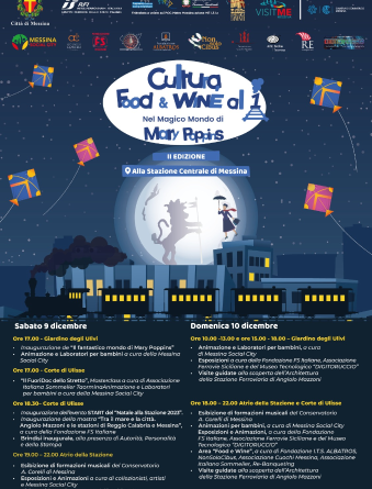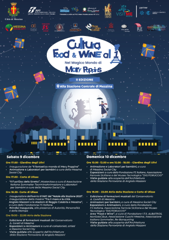 Presentato oggi, lunedì 4 dicembre, presso la Sala Mazzoni della Stazione Centrale di Messina, il programma della II Edizione di “Cultura, Food e Wine al Binario 1 con il Magico Mondo di Mary Poppins”, il personaggio che quest’anno animerà i presenti con i suoi straordinari amici al posto del maghetto Harry Potter della scorsa edizione.