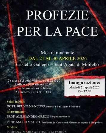 Sant’Agata di Militello si prepara a diventare il centro di un’importante riflessione collettiva. Dal 21 al 30 aprile 2026, le storiche mura del Castello Gallego ospiteranno la mostra itinerante “Profezie per la Pace”, un’iniziativa promossa dall’associazione Il Portico di Salomone in sinergia con l’amministrazione comunale.