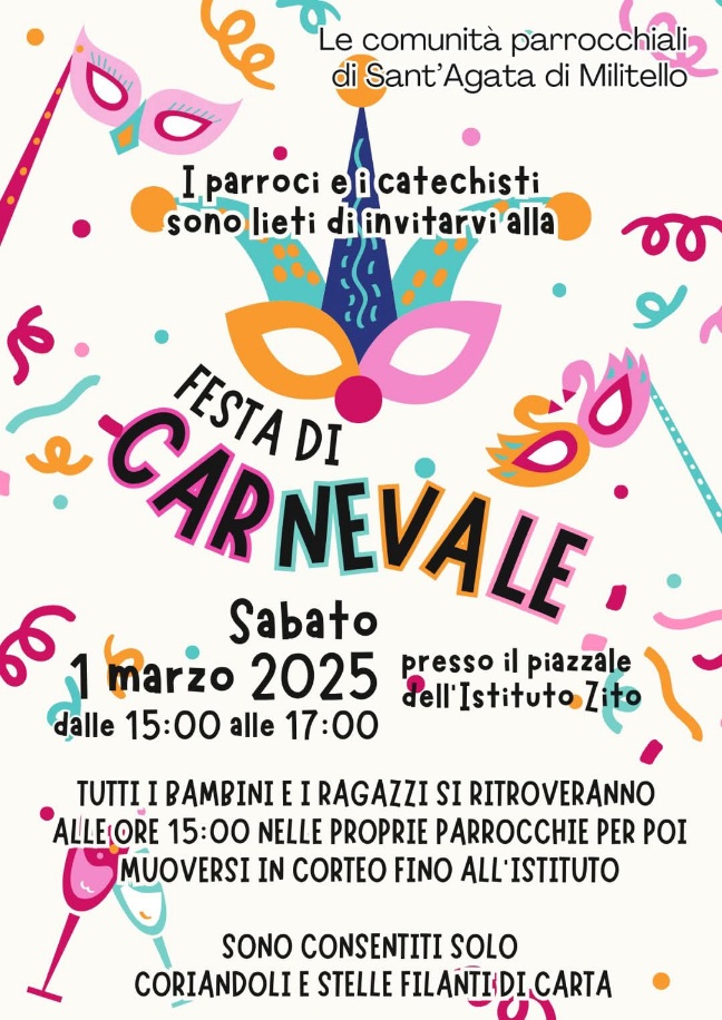 Le comunità parrocchiali di Sant’Agata di Militello, con i parroci e i catechisti, sono liete di invitare tutti i bambini e i ragazzi alla grande festa di Carnevale che si terrà sabato 1 marzo 2025. L’evento si svolgerà dalle 15:00 alle 17:00 presso il piazzale dell’Istituto Zito.