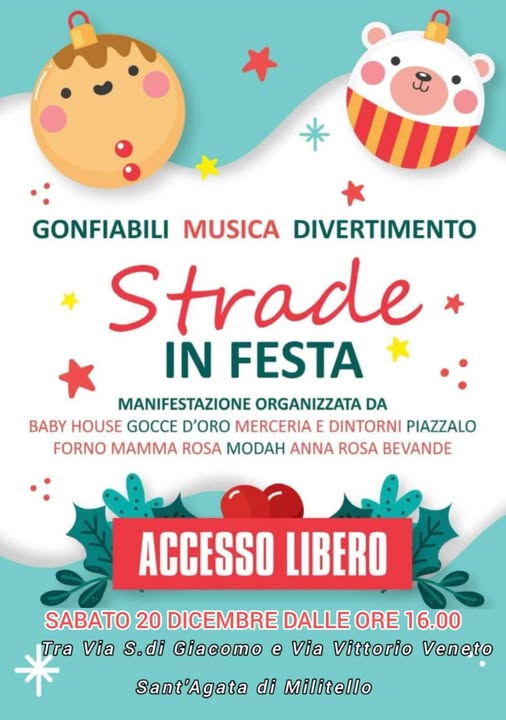 Sabato 20 dicembre, a partire dalle ore 16:00, le vie del centro di Sant’Agata di Militello si trasformeranno in un palcoscenico a cielo aperto per l’evento “Strade in Festa”, un appuntamento dedicato alle famiglie, ai bambini e a chiunque voglia vivere la magia delle festività in comunità.