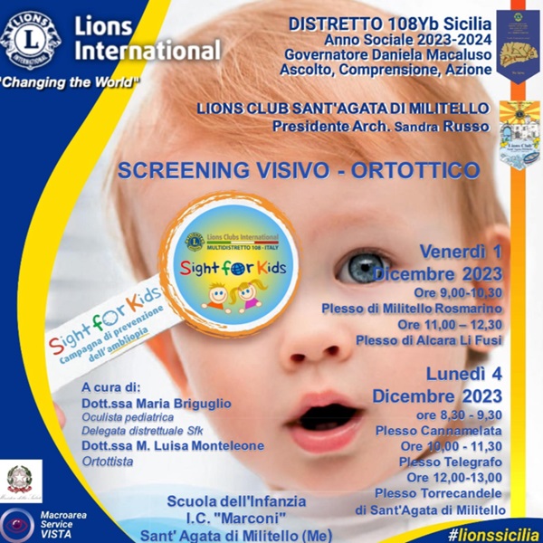 Grande partecipazione per il service nazione“ Sight for Kids”organizzato dal Lions Club di Sant’Agata Militello, presieduto dall’architetto Sandra Russo , che ha consentito di effettuare 87 screening visivi gratuiti. Si tratta di un service nazionale del Multidistretto Lions 108 ITALY nel garantire uno screening gratuito dell’ambliopia (occhio pigro) nei bambini fra i 0 ed i 6 anni. “Le attività di screening visivo “Sigh for kids”-precisa la presidente Russo- sono state poste in essere in due giornate nelle scuole dell’infanzia dell’Istitutocomprensivo “G. Marconi”, che ha tre plessi nel comune di Sant’Agata, uno ad Alcara Li Fusi ed uno a Militello Rosmarino, tutti guidati dal dirigente scolastico Ingegnere Antonino Macula. “In totale sono stati visitati 87 bambini- afferma la presidente santagatese- di cui 10 in codice rosso e 18 in codice giallo. Levisite sono state effettuate dalla delegata distrettuale , Dottoressa Maria Briguglio, oculista pediatrica e dall’ortottista, Dottoressa Maria Luisa Monteleone, che l’architetto Russo e tutti i soci del Club ringraziano per la fattiva collaborazione”. “Per codice giallo – spiega l’oculista Briguglio- significa che i piccoli pazienti hanno un problema visivo che probabilmente richiede o richiederà occhiali, ma presumibilmente non vi è l’ambliopia o cosiddetta pigrizia dell’occhio, ma è opportuno fare un ulteriore visita per controllare la retina