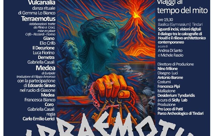 Vulcanalia (Insulae VII – VIII, Cisterna): riti e danza dei fuochi, con Gemma Lo Bianco. Terraemotus (Insulae VII – VIII, Cisterna): da Plinio a Croci, con Elio Crifò, Gabriella Casali e Luca Fiorino. Quando il dio Vulcano riunì a sé tutti i fuochi delle sue dimore – Stromboli, Etna, Vesuvio – per forgiare le armi invincibili di Enea, i fuochi si incunearono in incavi protervi, dal punto più estremo della Sicilia sino alle terre nere di Etna, diramandosi come serpi infuocate lungo la distesa d’acqua che separava Scilla e Cariddi. Come una maga incantatrice, tra sussurri e rumori, la Natura divina inviò i suoi segni, dando inizio ad accadimenti straordinari. Il Terraemotus colpì anche Tindari, scuotendo non solo le mura della città ma l’esistenza stessa dei suoi abitanti.