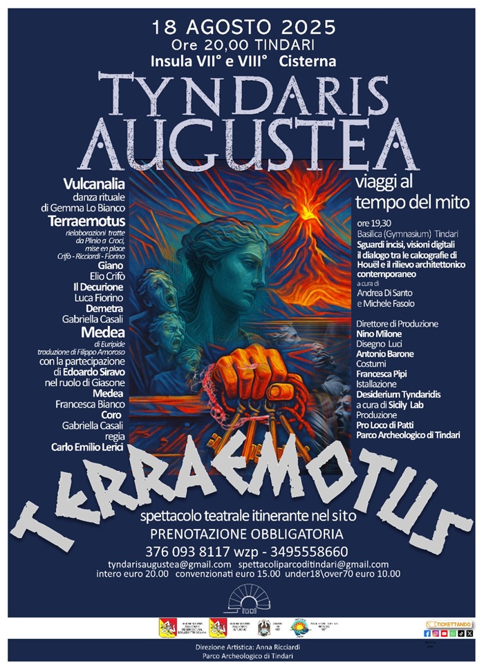 Il 18 agosto torna l’atteso viaggio tra i tesori dell’area archeologica di Tindari, dove è in fase di allestimento l’ottava edizione di Tyndaris Augustea: evento che attraverso la formula del “site specific” intende diffondere e valorizzare la storia, i miti e l’archeologia, secondo una trama ben collaudata e ideata nel 2018 da Anna Ricciardi, oggi direttrice artistica del Parco Archeologico. L’evento, in programma a partire dalle ore 20.00, è prodotto dal Parco Archeologico di Tindari (diretto dall’arch. Giuseppe Natoli) e dalla Proloco di Patti (presieduta da Nino Milone). Si tratta di un progetto culturale che il Parco Archeologico continua a sostenere con forza, in linea con gli obiettivi di valorizzazione dell’area archeologica di Tindari e di tutti i siti che compongono l’ambito territoriale, attualmente protagonisti della rassegna “Il Sorriso degli Dei”. Lo spettacolo teatrale itinerante attraverserà, anche quest’anno, i monumenti centrali del sito, ma con particolare attenzione alla “Cisterna” e alle Insulae VII e VIII. La Tyndaris Augustea immaginata quest’anno da Anna Ricciardi si svilupperà nel segno del “Terraemotus”, inteso alla stregua di tutto ciò che spaventa e che crea voragini emotive, aprendo un varco verso la catarsi liberatoria della vita. Divinità, madri protettrici e riti apotropaici saranno i protagonisti di un rito propiziatorio di salvezza. Prima dell’inizio degli spettacoli sarà possibile visitare la mostra multimediale “Sguardi incisivi, Visioni digitali” allestita negli spazi della “Basilica” e curata dall’Arch. Dott. Andrea Di Santo e dal Dott. Ric. Michele Fasolo (Archeomatica),