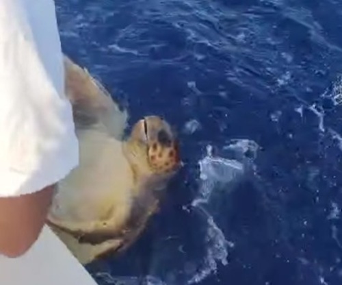 Quando però si sono resi conto che la tartaruga aveva ingoiato un amo rimastole in gola, hanno contattato la Guardia Costiera, caricato l’esemplare in barca e raggiunto l’equipaggio di una motovedetta che l’ha presa in carico.